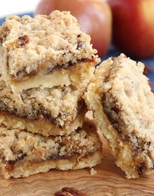 These soft and chewy cheesecake bars are topped with apple butter and a sweet pecan streusel. Easy to make and a fantastic way to mix up your usual holiday cookie tray.