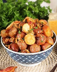 Crispy, crunchy, salty, buttery…..it’s a flavor explosion in these Parmesan Roasted Potatoes with Bacon. So simple to make in just one pan and a fantastic side dish for any occasion whether it be a quick weeknight dinner or an elegant dinner party. Perfect results every time!