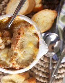 Homemade French Onion Soup is a savory soup made of caramelized onions cooked in beef stock or beef broth and is usually served gratinéed with baguette slices or crostini covered with melty cheese. It’s simple to make and impressive to share with guests.
