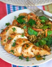 - Toss the rice and veggies with a fork to fluff. Serve the chicken with the rice.