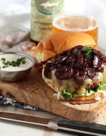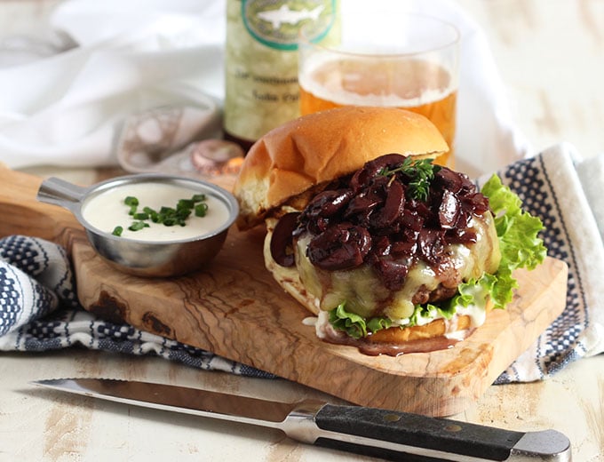 All the flavors of the classic french stew packed into a burger! This Beef Bourguignon Burger with Horseradish Creme Fraiche is as amazing as it sounds. Real Angus Beef burgers grilled to perfection then blanketed with melty Comte cheese and wine soaked mushrooms. Seriously amazing.