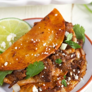 - Immediately top the tortilla with the shredded Oaxaca cheese. When the cheese has melted, add some of the shredded beef and fold one side of the tortilla over the other. Fry until crisp.