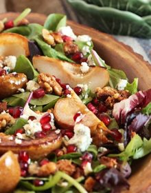 Bourbon Roasted Pear Salad with Gorgonzola is dressed with a light and tangy apple cider vinaigrette, perfect for the holiday season. Juicy pears roasted with bourbon and brown sugar then combined with leafy greens, blue cheese and sweet, crunchy candied walnuts for the most memorable salad ever.