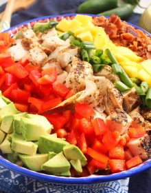 I like a good cobb salad, but I LOVE Caribbean Cobb Salad! Everything about this easy to make salad is deliciously satisfying. The grilled chicken is absolutely mouthwatering from the jerk seasoning, the veggies and mango chunks keep things oh so freshly flavored, and there’s plenty of the quintessential cobb ingredient we all know and love – BACON!