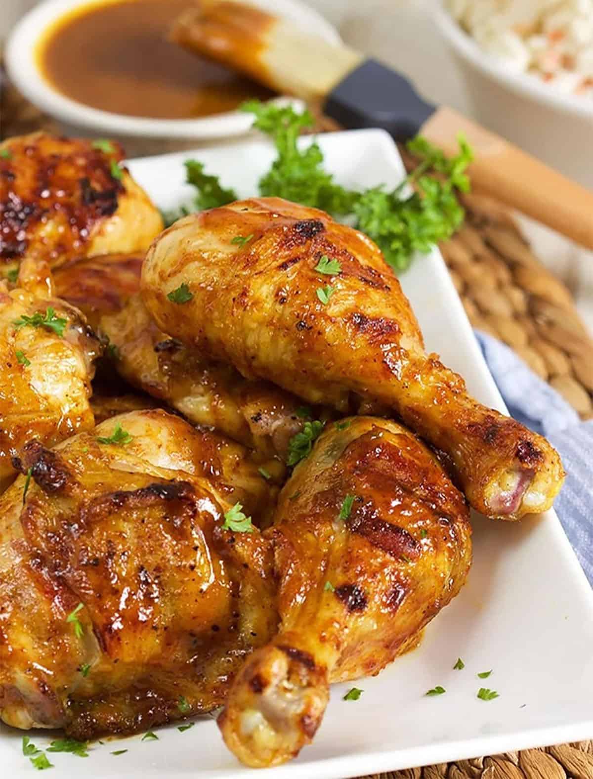 - Chicken thighs and drumsticks are especially good here because they stay juicy on the grill and hold up well to repeated basting.