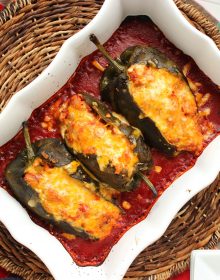 Besides swapping the green poblanos for red ones, you can also make this dish spicier by adding some crushed red pepper flakes and/or cayenne powder to the filling. Also, feel free to serve these peppers with your favorite hot sauce!
