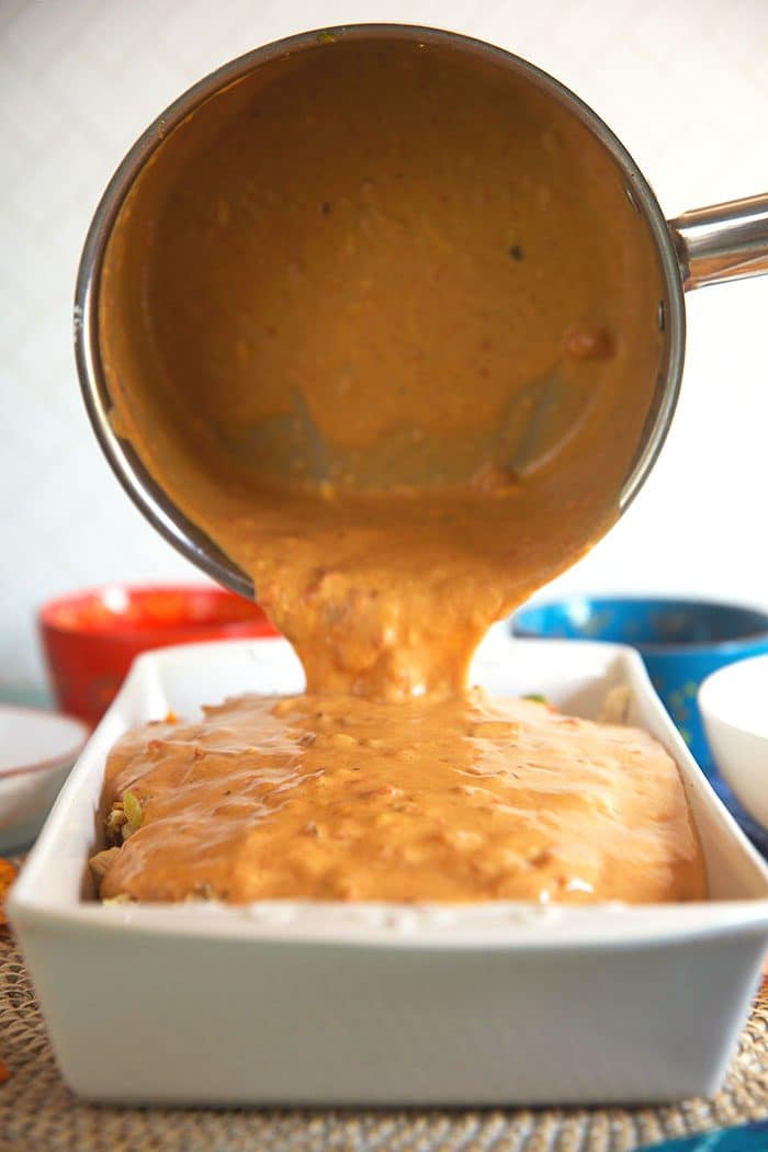 - Pour the cream sauce over the casserole and mix it in with a spatula just a bit so it can work it’s way down to the bottom of the dish.