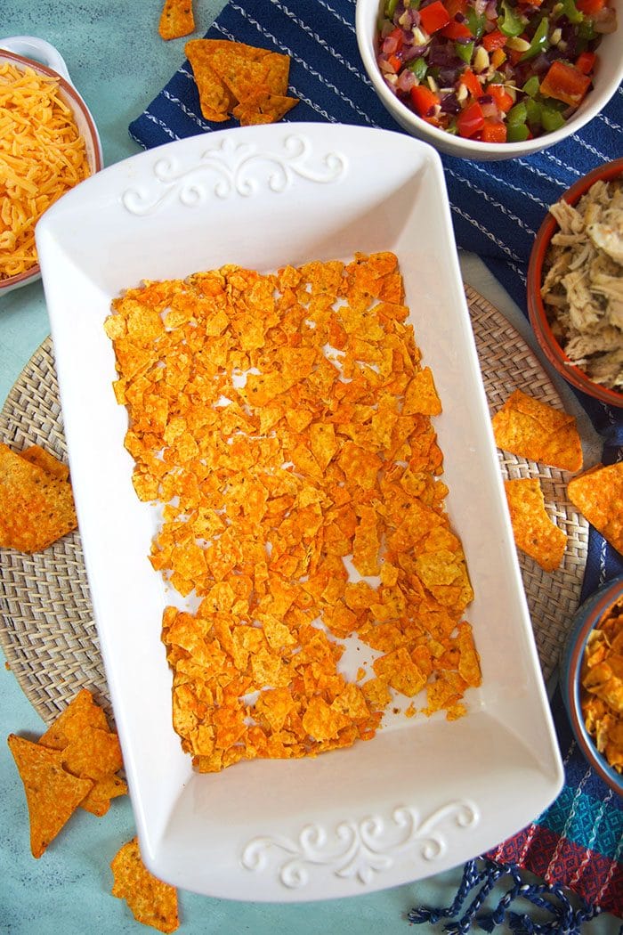 - Add 1/3 of the Doritos to a 9 x 13 inch baking dish coated with cooking spray. Arrange 1/2 the chicken in an even layer over the Doritos and top with 1/2 the vegetables. Top with 1/3 of the Doritos. Arrange 1/2 the chicken over the layer of chips and then top with the vegetables.