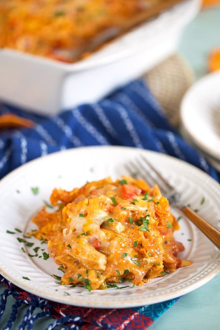 This casserole is seriously incredible. I mean where do I start? The flavors in it are so good and who would have that Doritos would be awesome in there but oh my gosh they just make the dish!