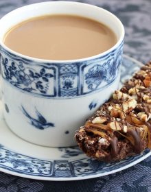Rich, crisp, chocolate biscotti drenched in creamy caramel and dark chocolate, sprinkled with chopped pecans and dipped into a steaming mug of coffee or cocoa. There’s no better way to start, or end, the day.