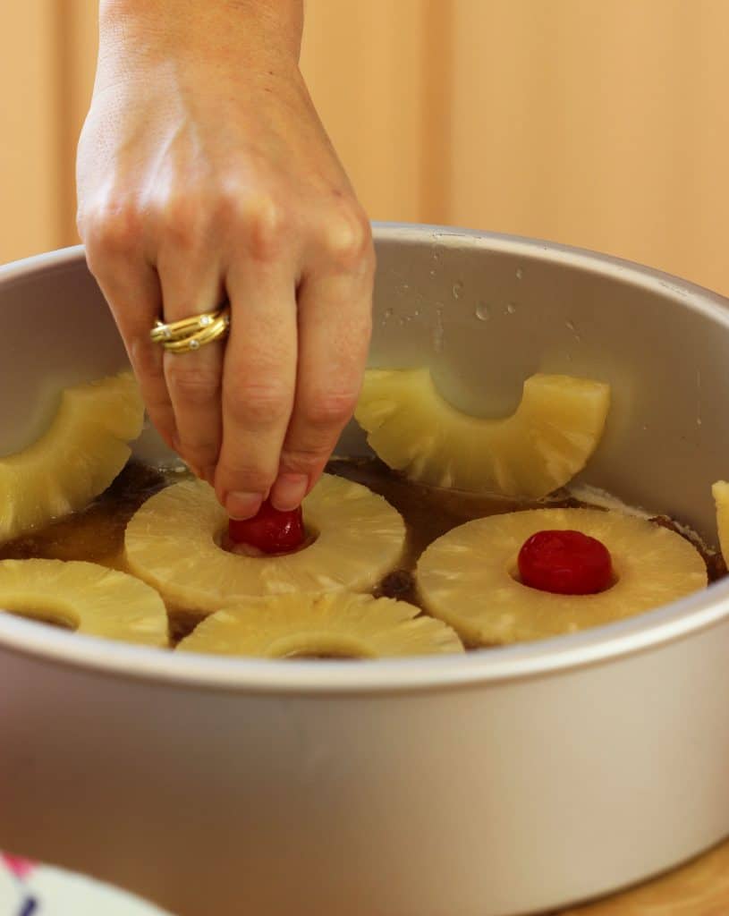 - Arrange the pineapples and cherries on top of the butter mixture and up the sides, if desired. Set aside.