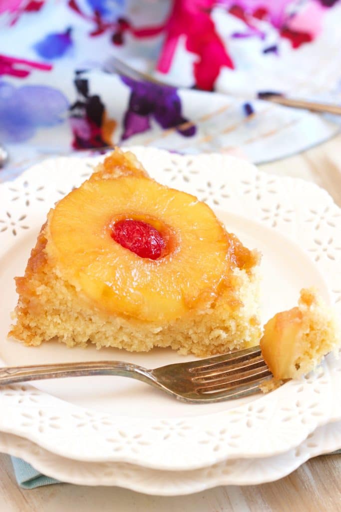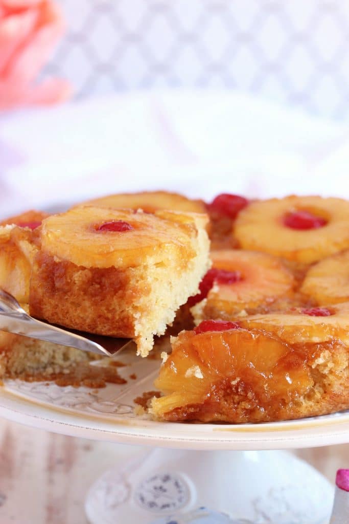Upside down cake is a single layer cake assembles with the toppings on the bottom topped with a buttery batter. Hence the name, upside down cake. Pineapple Upside Down Cake is the most common flavor but it can be made with other fruits, as well.
