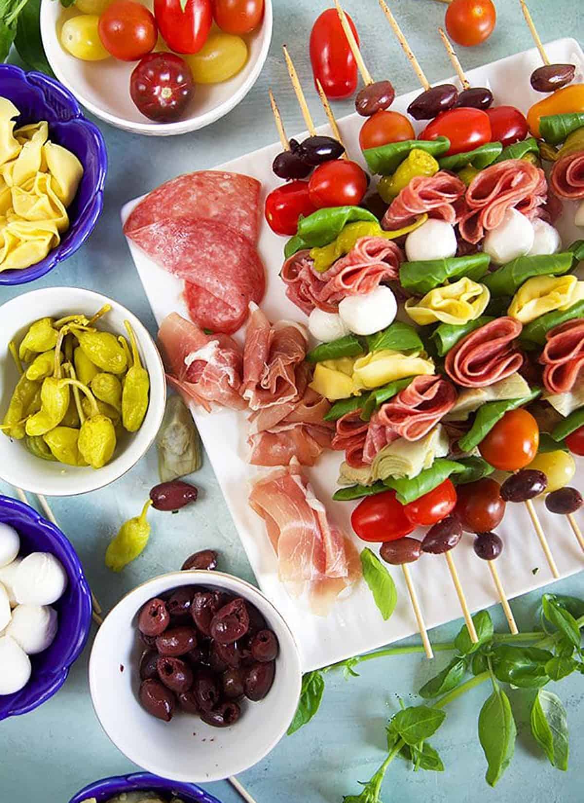 Also, it’s typical for Italians to serve an Antipasto plate consisting of meats, cheeses, olives, etc. By putting everything onto one skewer, it’s so much easier for guests to grab and go and mingle and sip without having to return back to a charcuterie board again and again. Plus, it’s just fun serving food on a stick. Right?
