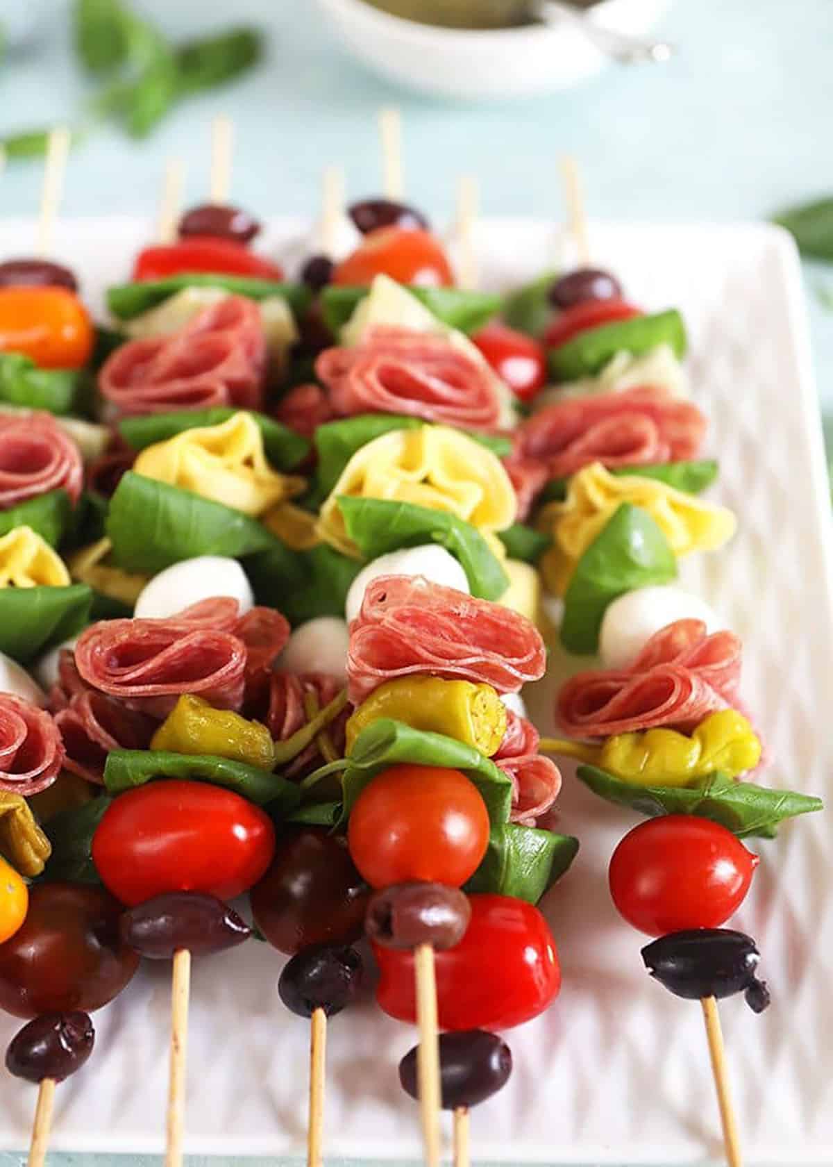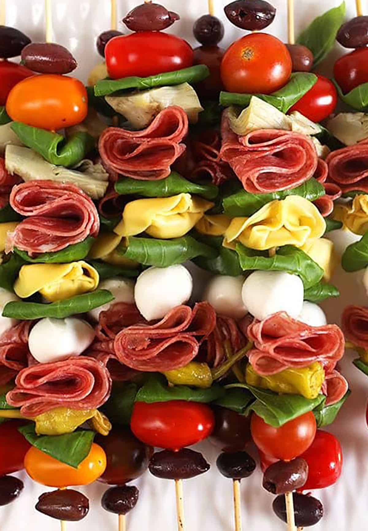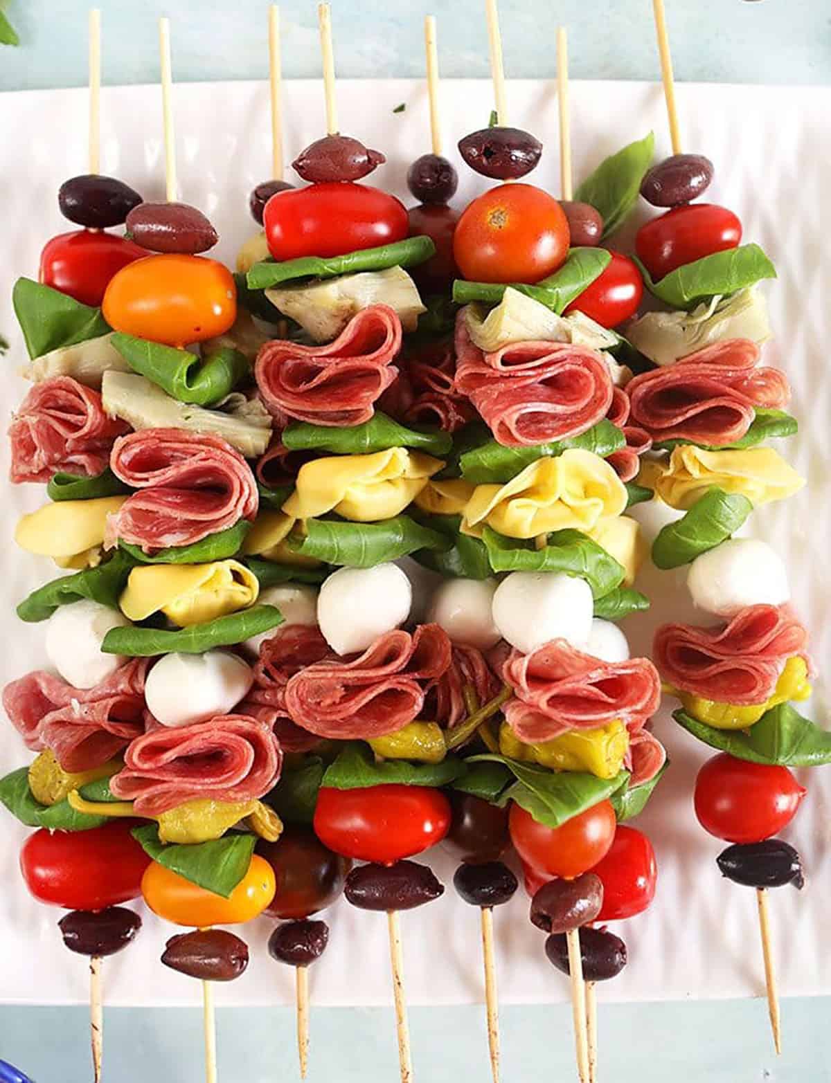 Easiest Italian appetizer ever, Antipasto Skewers are loaded with the same zesty flavors in your favorite Antipasto Salad but in single serve, grab and go, food on a stick goodness!. Super simple to throw together for a party any time of year.