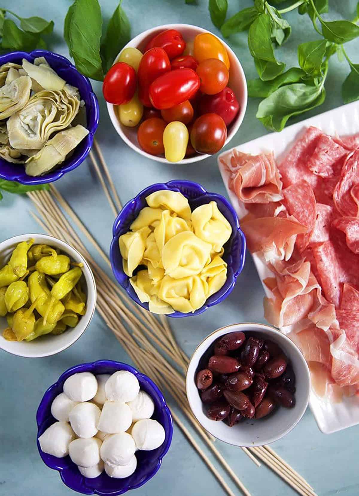 Some typical ingredients for an Italian Antipasto consist of an assortment of meats and cheeses, olives, pepperoncini, artichokes, anchovies and vegetables. I like to add a cheese tortellini to the mix just for heartiness and, well, cheese tortellini is amazing. You can leave it out if you’re following a low carb, keto or gluten free diet.