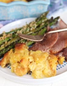 Our favorite side dish for ham…..this easy Baked Pineapple Casserole is a family tradition for Easter. It goes with just about any main dish recipe but ham and pineapple go together like Mac and cheese…basically.