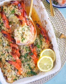Easy weeknight dinner or fancy pants dinner party, this easy Baked Shrimp Scampi recipe comes together quickly and simply. Jumbo shrimp baked in a garlicy, white wine sauce with a hint of lemon and topped with a crispy, buttery, crunchy crust. It’s a new family favorite for sure!