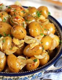 Grilled baby Yukon potatoes on a bowl with garlic and onions.