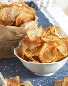 Super easy Homemade Salt and Vinegar Potato Chips made with just three ingredients….salt, vinegar and potatoes. If you’re a lover of salt and vinegar chips, you need to do yourself a favor and make a batch right away.