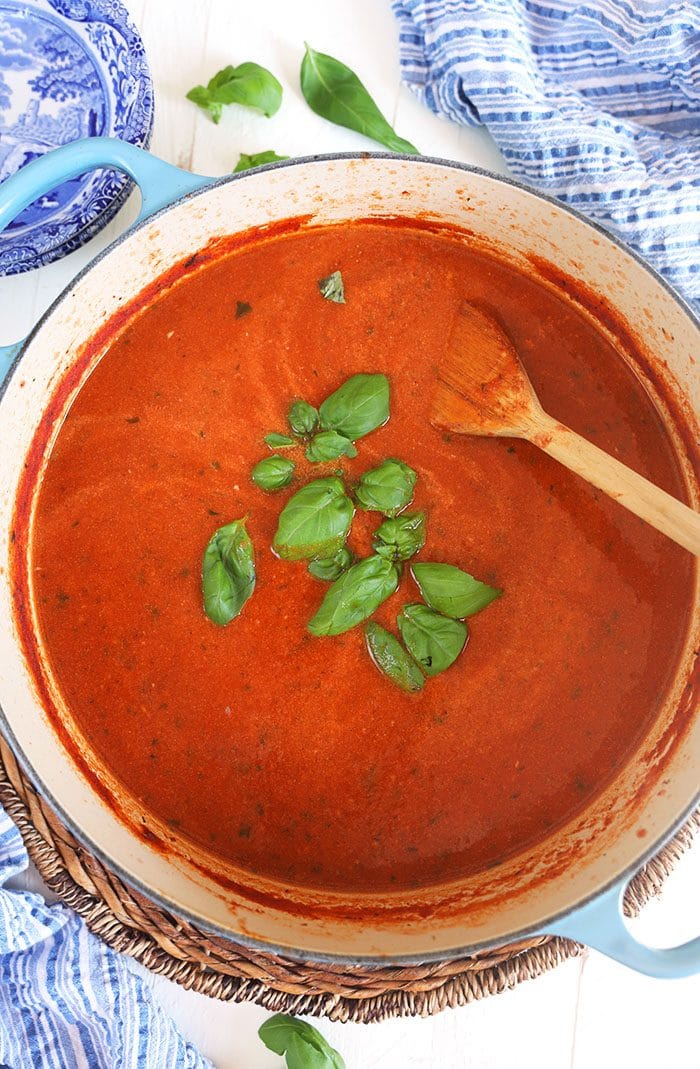 Tomato Soup made better! Quick and easy Tomato Basil soup recipe is super simple to whip up in less than 30 minutes. A great weeknight dinner that’s hearty, comforting and better than anything in can. Smooth, creamy but light…this recipe will be on repeat all year long.