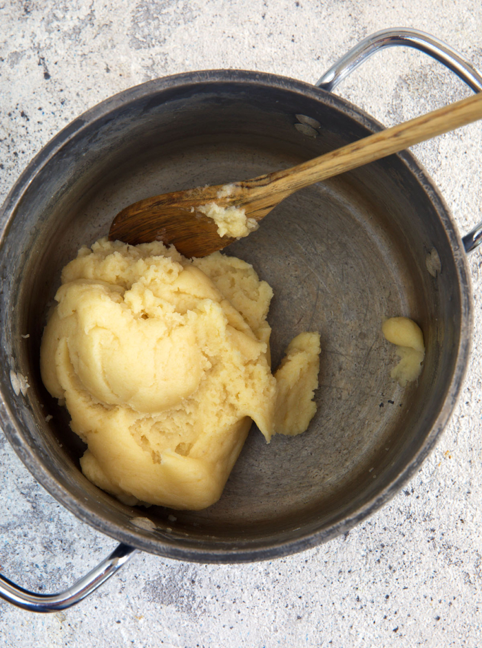 - Stir in the flour with a wooden spoon until a smooth dough forms; stir over low heat until it starts to dry out and pulls away from the sides of the pan, approximately 2 minutes.