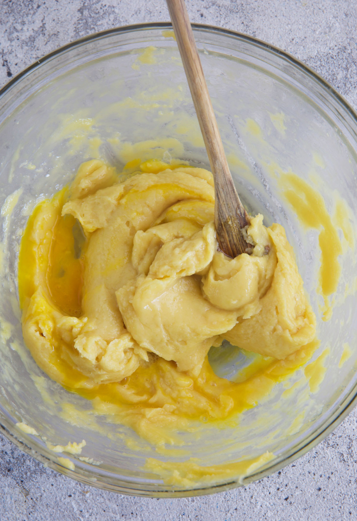 - Add one egg at a time. Patience is definitely a theme with gougères! Mix each egg in completely before adding the next.