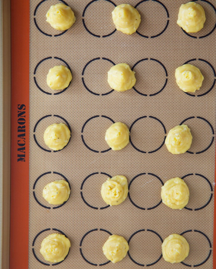 - Form the gougères. Scoop the dough into a piping bag and pipe tablespoon-sized mounds onto baking sheets. Sprinkle with cheese.