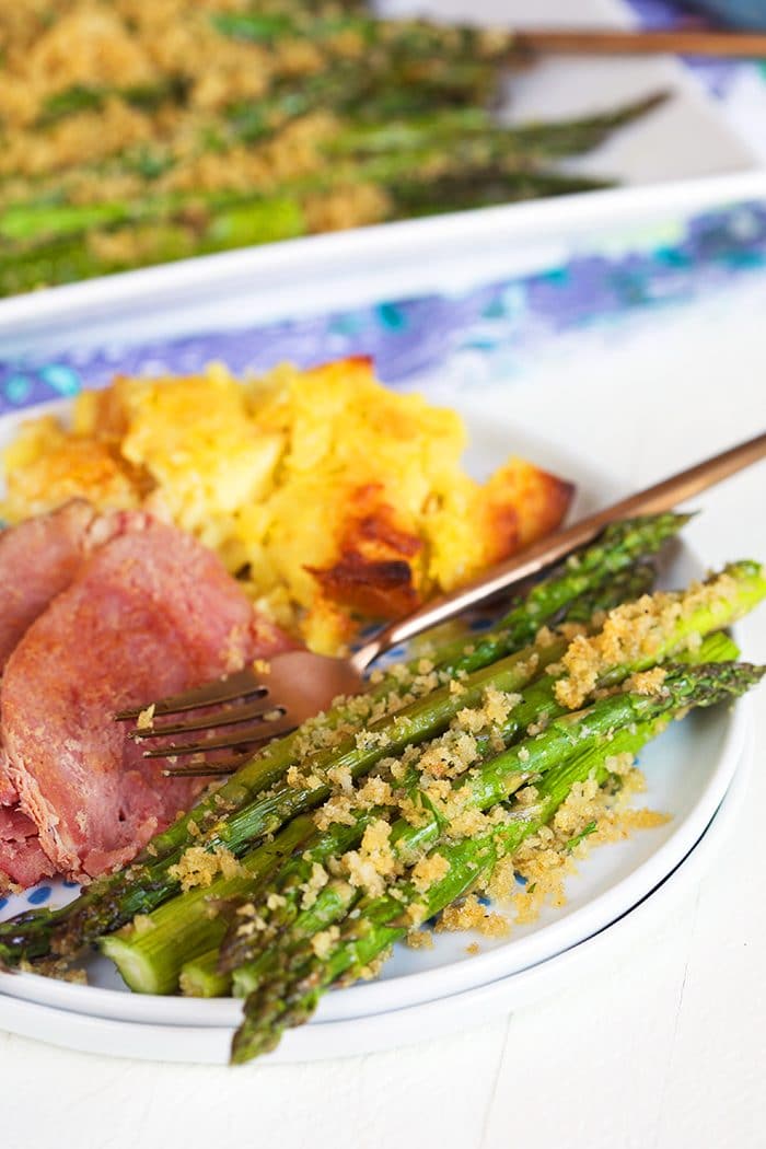 I eat the whole asparagus stalk, it’s fantastic swimming in butter and I also love grilled asparagus, steamed, baked or roasted. I’m not a picky eater. My son, he won’t touch it unless I make it with a buttery crumb topping like I did for this Garlic Parmesan Baked Asparagus. It’s a huge hit and goes so well with things like Crock Pot Ham.