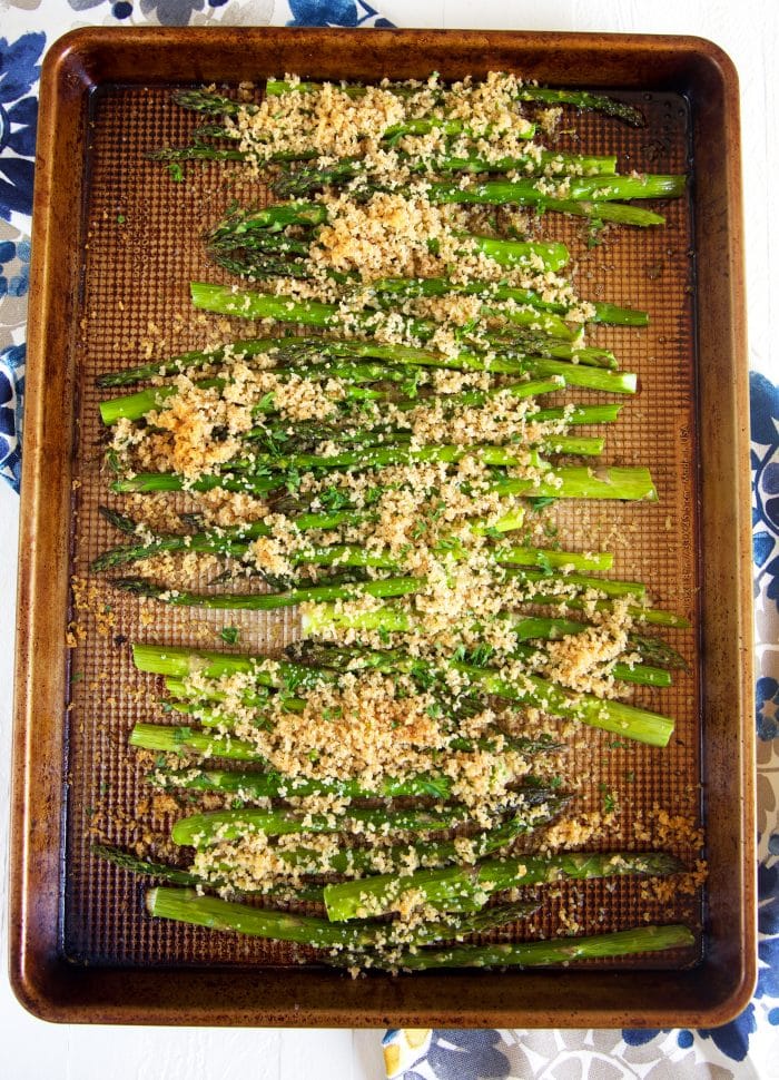 - Sprinkle the panko mixture evenly over the asparagus. Transfer to the oven.