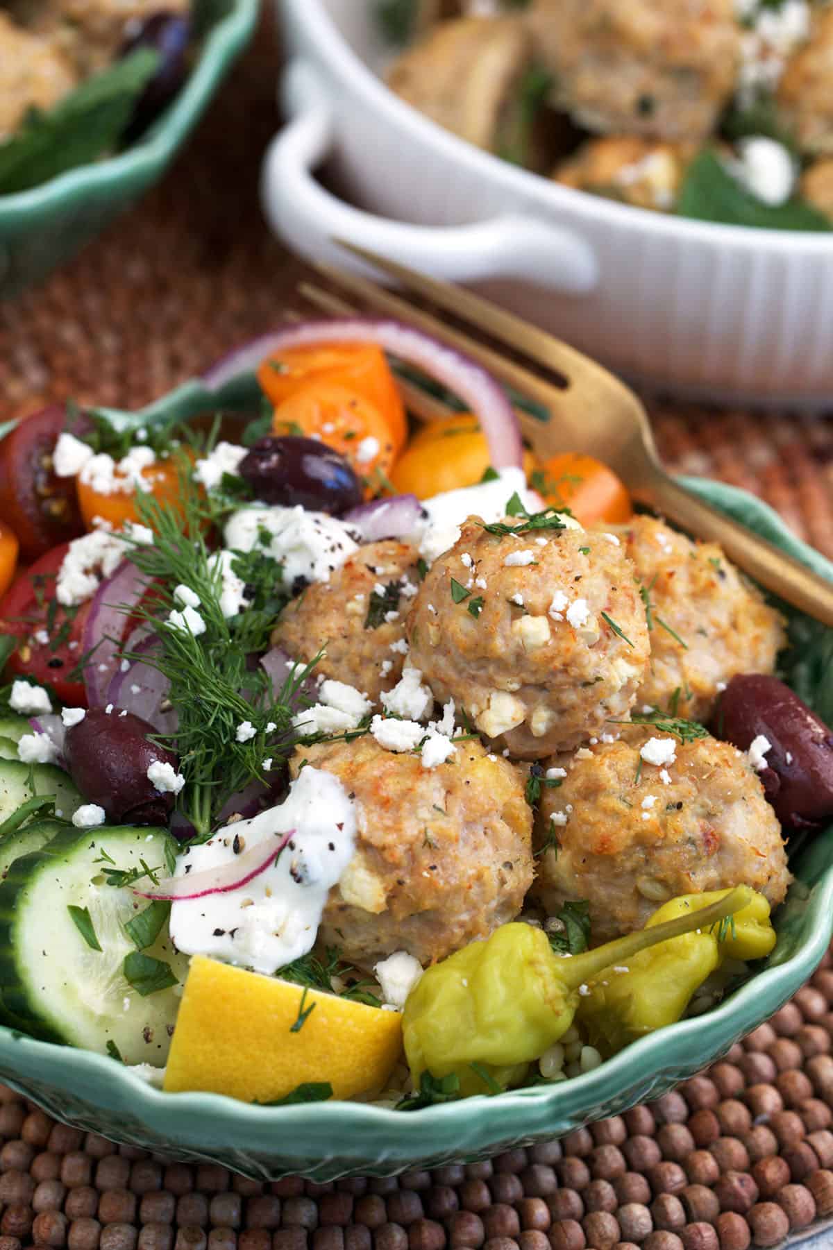 - Greek chicken meatball bowls: lemony orzo + tzatziki + olives + pepperoncini + crunchy veggies