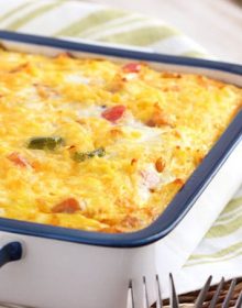 Easy, cheesy and light…this Ham, Cheddar and Hash Brown Breakfast Casserole is so simple to whip up for brunch. Perfect for a crowd and not loaded with calories, perfect with a colorful fruit salad.