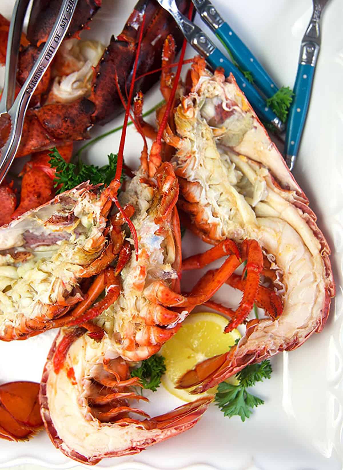 - Serve the lobsters with melted butter and lemon.