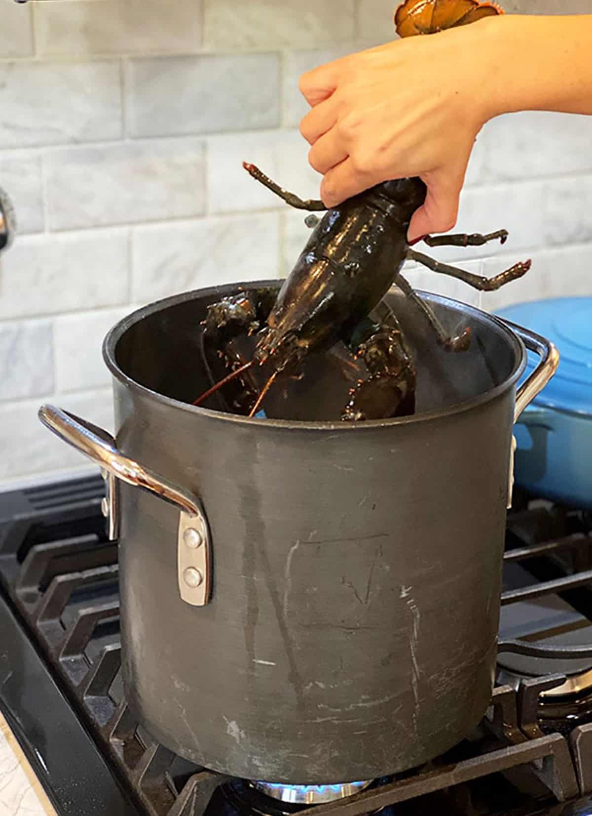 - Grasping the lobsters by the body, add the lobsters to the pot headfirst and cover the pot.
