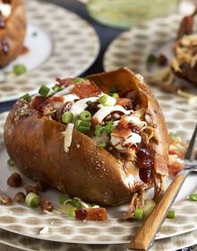 Sweet, spicy, creamy, crunchy….there’s a little bit of everything in these easy to make Loaded Pulled Pork Stuffed Sweet Potatoes. A simple dinner that tastes anything but….this recipe is a great way to use up any leftovers you may have hiding in the fridge.
