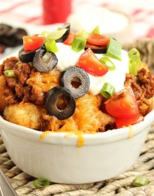 Seasoned ground beef, cheese and your favorite taco toppings all piled high on a mountain of tater tots. A great game day “snack” or busy weeknight meal the kids will love. Loaded Taco Tater Tots are ready in less than 30 minutes.