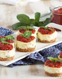 A savory twist on cheesecake to dress up your summer cheese course, these Mini Basil Parmesan Cheesecakes are perched on a buttery cracker crust and topped with tangy tomato jam. Light, airy, creamy and slightly salty, they will disappear in a flash at any party.