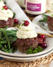 Frost the meatball cupcakes. Spoon ready-made mashed potatoes into a resealable bag, and snip off the tip of one of the corners. Use this make-shift piping bag to add a swirl of mashed potatoes to the top of each Mini Meatloaf. Top each “cupcake” with a cranberry garnish and serve immediately.