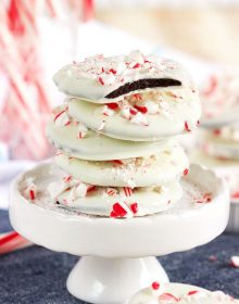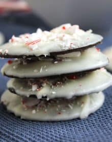 Light and crispy chocolate wafers dipped in peppermint-infused white chocolate and then sprinked with crushed candy canes…..these are the ultimate holiday cookie. Easy to make No Bake Peppermint Bark Cookies are made with only four ingredients and no baking required. You will have trouble keeping these around.