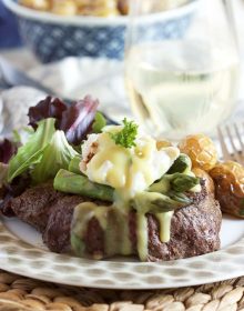 If you want a more Bearnaise flavor, chop up some fresh tarragon, minced shallots and stir that in. It gives the sauce an amazing anise flavor that is spectacular. Or you can use my homemade béarnaise sauce, it’s super simple.