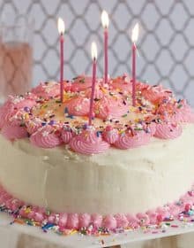 I love to make this layer cake recipe for my own birthday (when I’m not making this Milk Bar Birthday Cake) because it’s pink, sweet and so very girly. Plus, I just love the flavor of Pink Champagne so it’s fitting that it works perfectly in a buttery cake batter. It makes the perfect 21st birthday cake for your favorite girl, too, along with some DIY Confetti Party Poppers!