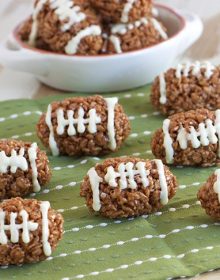 I wasn’t going to post these. I really wasn’t at all but I’ve been making them for years and that was the whole point of this site…to share some of my favorite recipes with friends and family. This is one of them. Just to give you a little background, I’m not a big football watcher. If I happen to catch a glimpse of a game…it’s totally by accident and most likely there was food in the vicinity so I saw it completely involuntarily. But I WAS a cheerleader…and then I WAS a cheer mom. And when you’re a cheer mom you have to do things like bake stuff for the bake sale table at the home game. AND since I was a cheer mom when I was working in an office full-time…baking wasn’t something I really wanted to do if I all I was going to do was give it away. Know what I mean? So, I often looked for things that made me look “Martha Stewart-like” without having to open the oven door. That’s how these Rice Krispie Treat Footballs came to be.