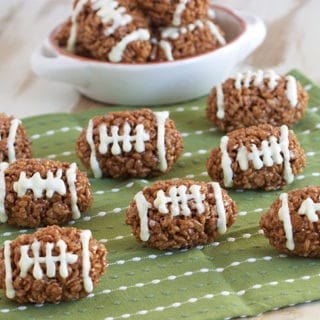 The cutest Rice Krispie Treats ever, these super easy to make Rice Krispie Treat Footballs are made with just a few ingredients and decorated with white chocolate laces. Fun for the kids to make and great for any football party or tailgate!