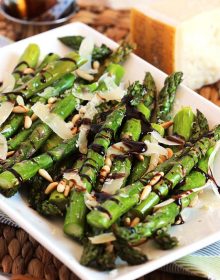 I like to serve my Roasted Asparagus with Pine Nuts, Parmesan and Balsamic Glaze with the aforementioned Rotisserie Chicken but it’s also amazing with my favorite Crispy Oven Baked Fried Chicken! Serve it at room temperature for a surprising summer side dish at your next barbecue with your Barbecue Chicken or just enjoy as a light lunch with a fried egg on top. This is one you’ll want to put your own spin on time and time again.