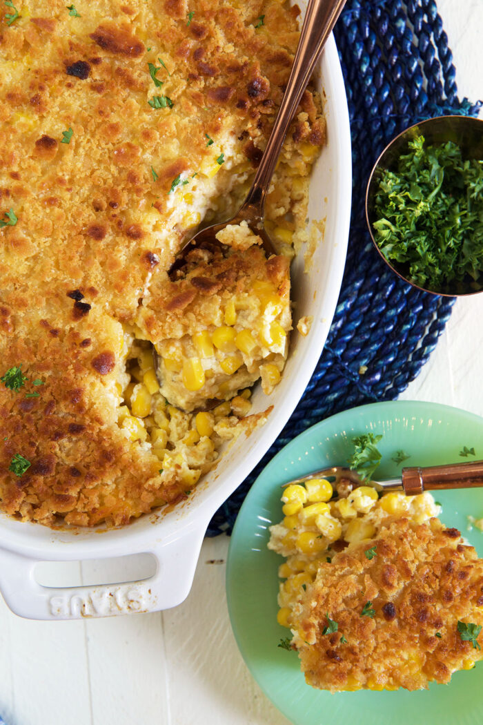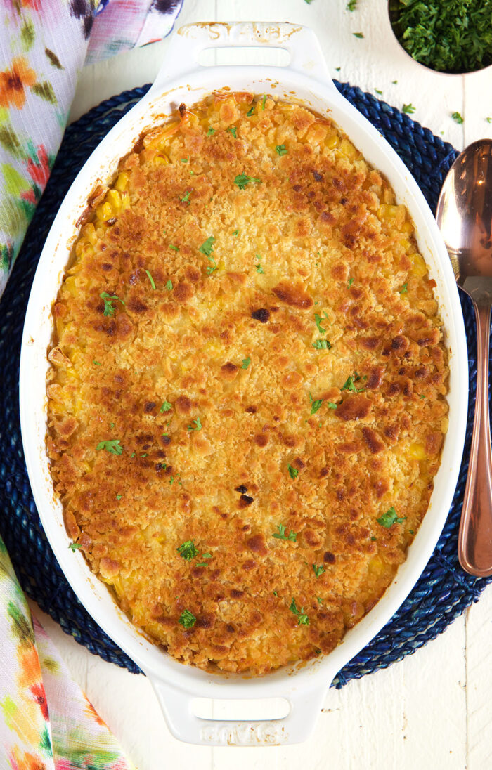 Scalloped Corn Casserole should come with a warning – it’s addictive AND will always steal the attention away from your main course! This side dish is incredibly easy to make and is loaded with flavor. It’s comforting, delicious, and wonderfully simple.