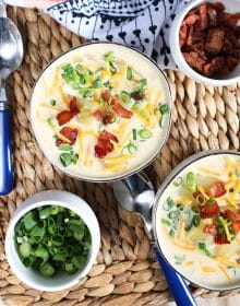The type of potato you use for this Slow Cooker Loaded Baked Potato Soup is pretty important. I like to use a buttery Yukon Gold because the chunks will still hold their shape but they will puree nicely and provide enough starch to create a velvety, creamy texture in the soup.