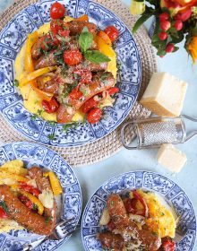 This is a great weekday meal, as well. And with spring right around the corner….those sports practices or just lazy evenings on the porch….take up a lot of time. This easy Sausage Peppers and Onions is sure to please everyone in the family. Even the easy Parmesan Polenta comes together in just a few minutes….and you could totally skip it, just grab a roll and make a sausage and pepper sandwich.