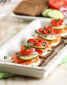 - Spread a teaspoon of the cream cheese mixture onto each slice of bread and then divide the salmon among them topping each with a sliver. Top each canapé with cucumber, red onion and tomatoes. Season with a little bit of kosher salt and pepper. Garnish with the remaining chives. Serve immediately.
