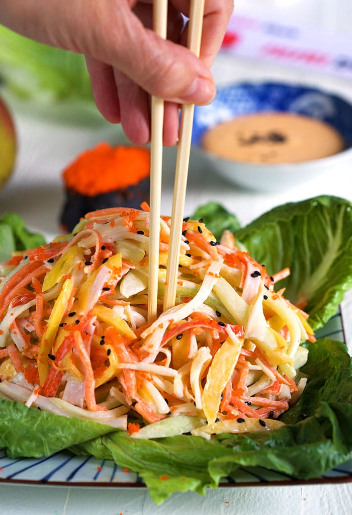 Skip the take out and make this easy Spicy Kani Salad recipe at home in minutes. Refreshing and simple, this imitation crab salad combines cucumber, mango and carrot in a creamy, light dressing that’s perfect for a light lunch or dinner.