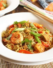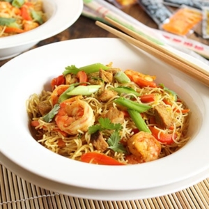 A favorite take-out dish ready in minutes, Singapore Chow Mei Fun are healthy and easy to make. Bursting with spice, this recipe will be on the table in less than 30 minutes and faster than delivery.