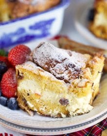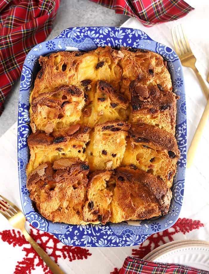 To serve your Panettone French Toast Casserole, I like to dust with a bit of powdered sugar. Since the breakfast casserole is already loaded with flavor and is somewhat indulgent, it’s best to keep it simple. You can also use maple syrup but I feel that it’s totally not necessary.